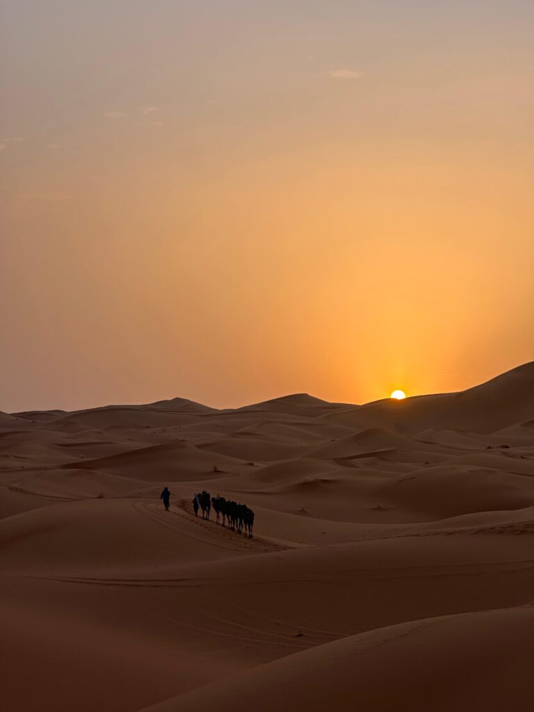 After breakfast, explore the stunning Dades Valley before driving to the spectacular Todra Gorge, with its towering cliffs. Continue towards Erfoud and Rissani, gateways to the Sahara Desert. Arrive at Merzouga (Erg Chebbi dunes), where a camel trek will take you across the golden sands at sunset. Spend the night in a desert camp, enjoying traditional Berber music and a magical starry sky.